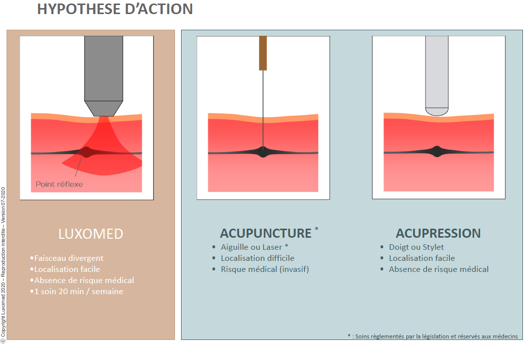 L’énergie du rayonnement infrarouge, via l’appareil médical, est transférée aux terminaisons nerveuses du corps qui constituent les points d’acupuncture et d’auriculothérapie, également appelés points reflexes.